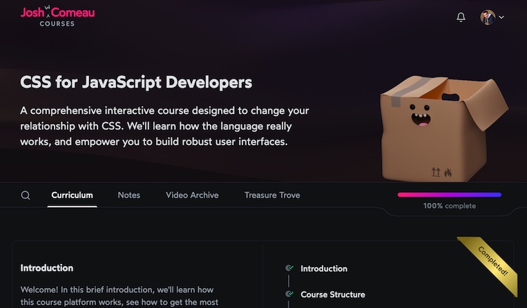 . Yes, you can feel that he just enjoys what he’s doing and that he wants to produce something of quality. You have to appreciate that as it’s definitely not a given these days. That is present in this course too, it’s comprehensive yet approachable. The content is thorough but split in nicely sized chunks.I leveled up my CSS skills, if you are coming from a Javascript developer perspective and you are eager to improve yours, this course will be a joy to complete. Go get it, it’s available under https://courses.joshwcomeau.com/css-for-js.